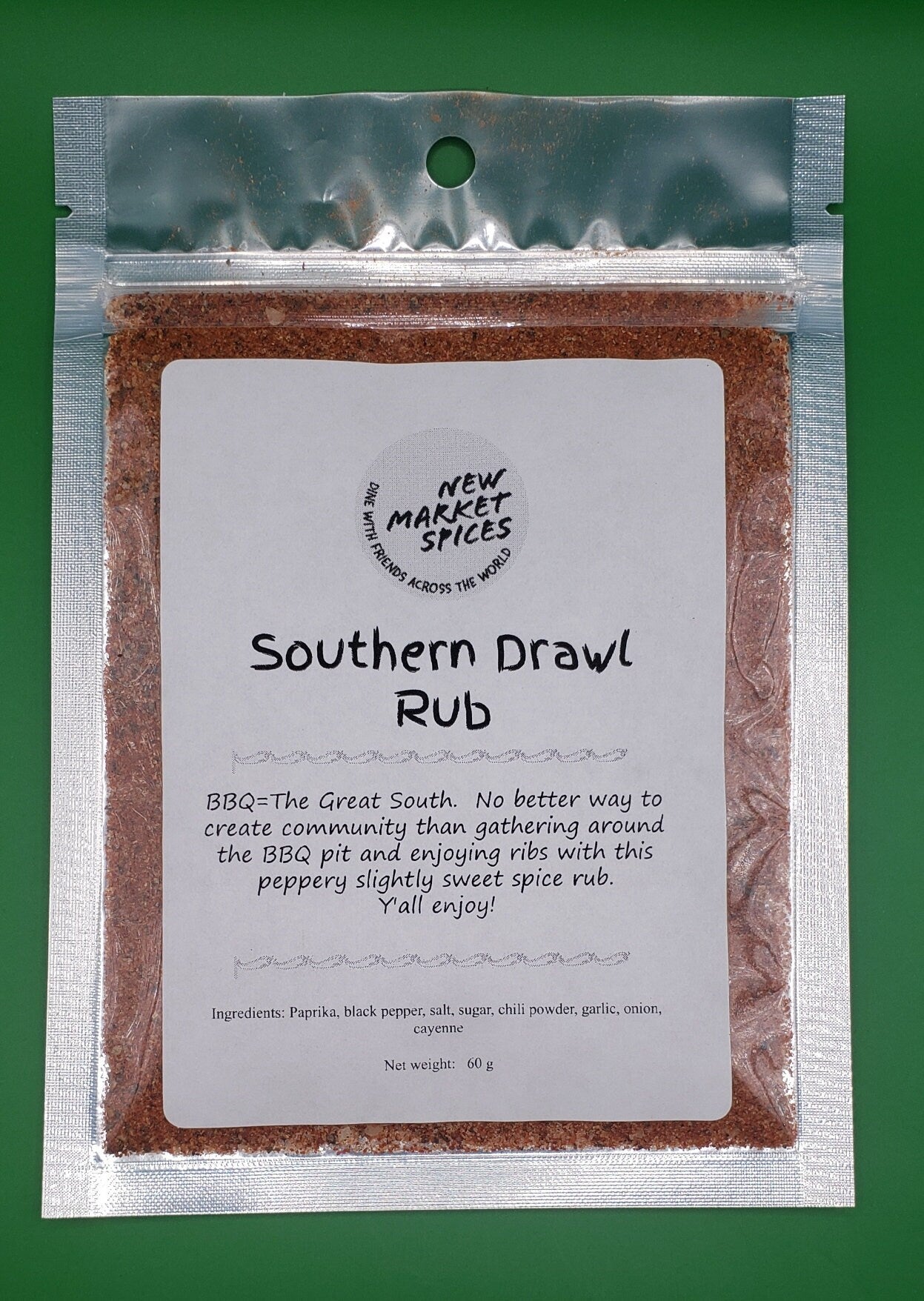 Whether you are in Maine or Mississippi, Alabama or Arizona, cooking on the BBQ grill is a food and friends event. Amp up your BBQ flavor with our Southern Drawl rub. Paprika, chili powder, salt and pepper create a slightly sweet and spicy rub for everything BBQ from ribs to wings. Follow us on Instagram @newmarketspices for new spice blends and recipes.